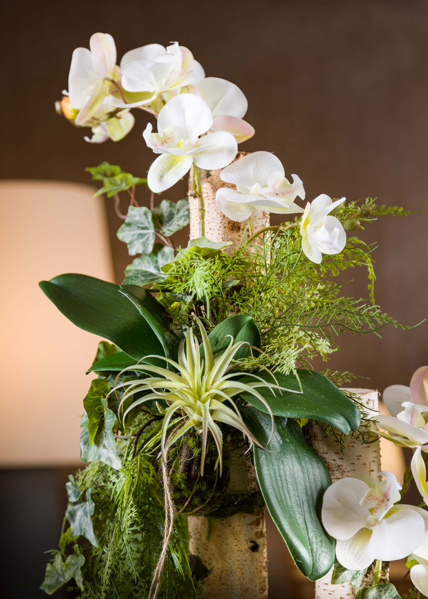 Le Orchidee finte bianche, protagoniste di queste composizioni, sono tanto realistiche da sembrare appena colte da un giardino reale. La cura dei dettagli è evidente in ogni elemento: dalle piante artificiali cadenti che aggiungono una sensazione di lussureggiante naturalezza ai tronchi di betulla naturali che fungono da base stabile ed elegante.