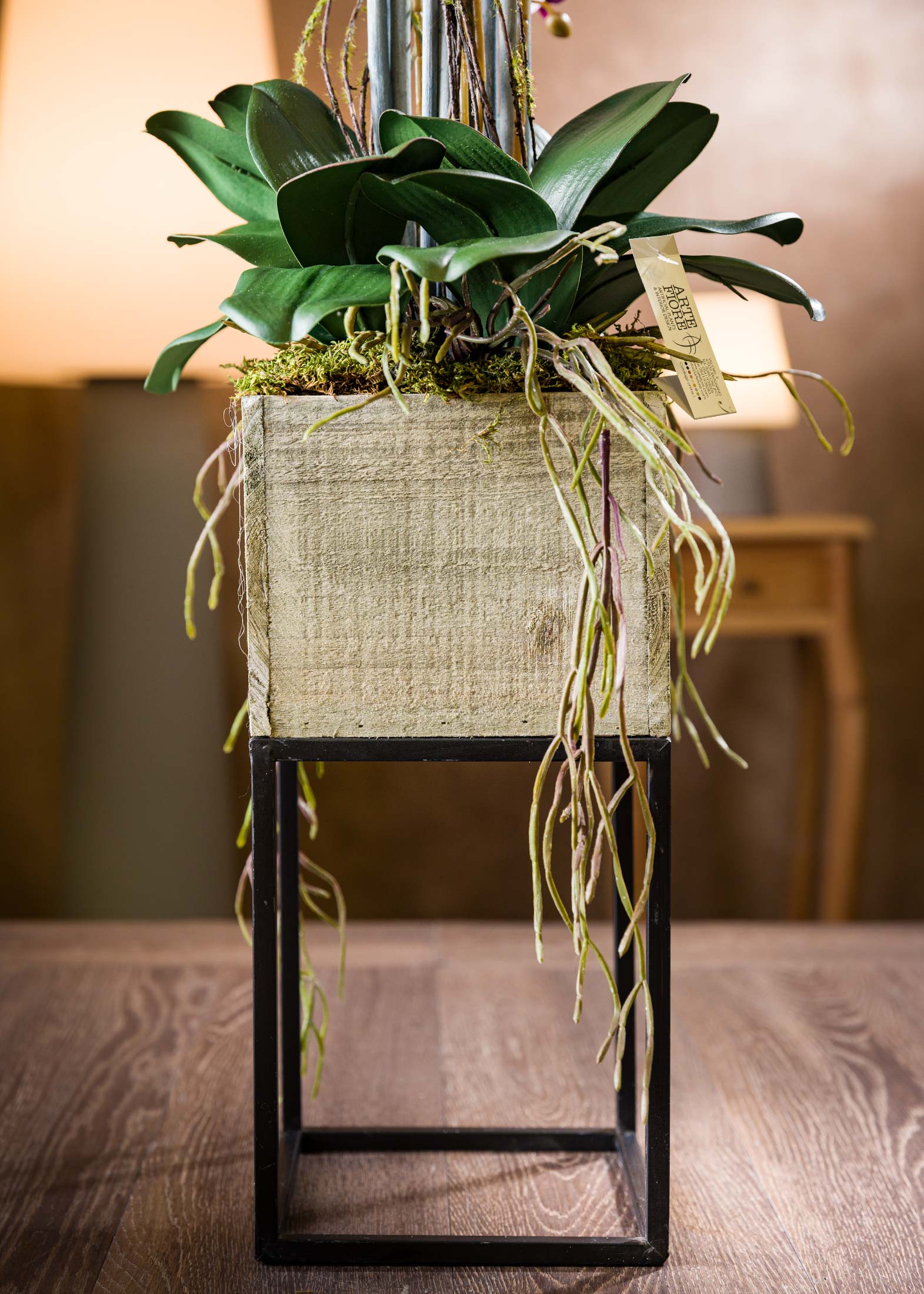 Scegli la nostra Composizione con orchidee in vaso di legno e metallo per aggiungere un tocco di eleganza e raffinatezza alla tua casa o al tuo ufficio. Grazie alla sua bellezza e naturalezza, questa composizione è un’opzione perfetta per coloro che amano la bellezza senza tempo dei fiori, ma desiderano evitare il costo e la manutenzione delle piante vere.