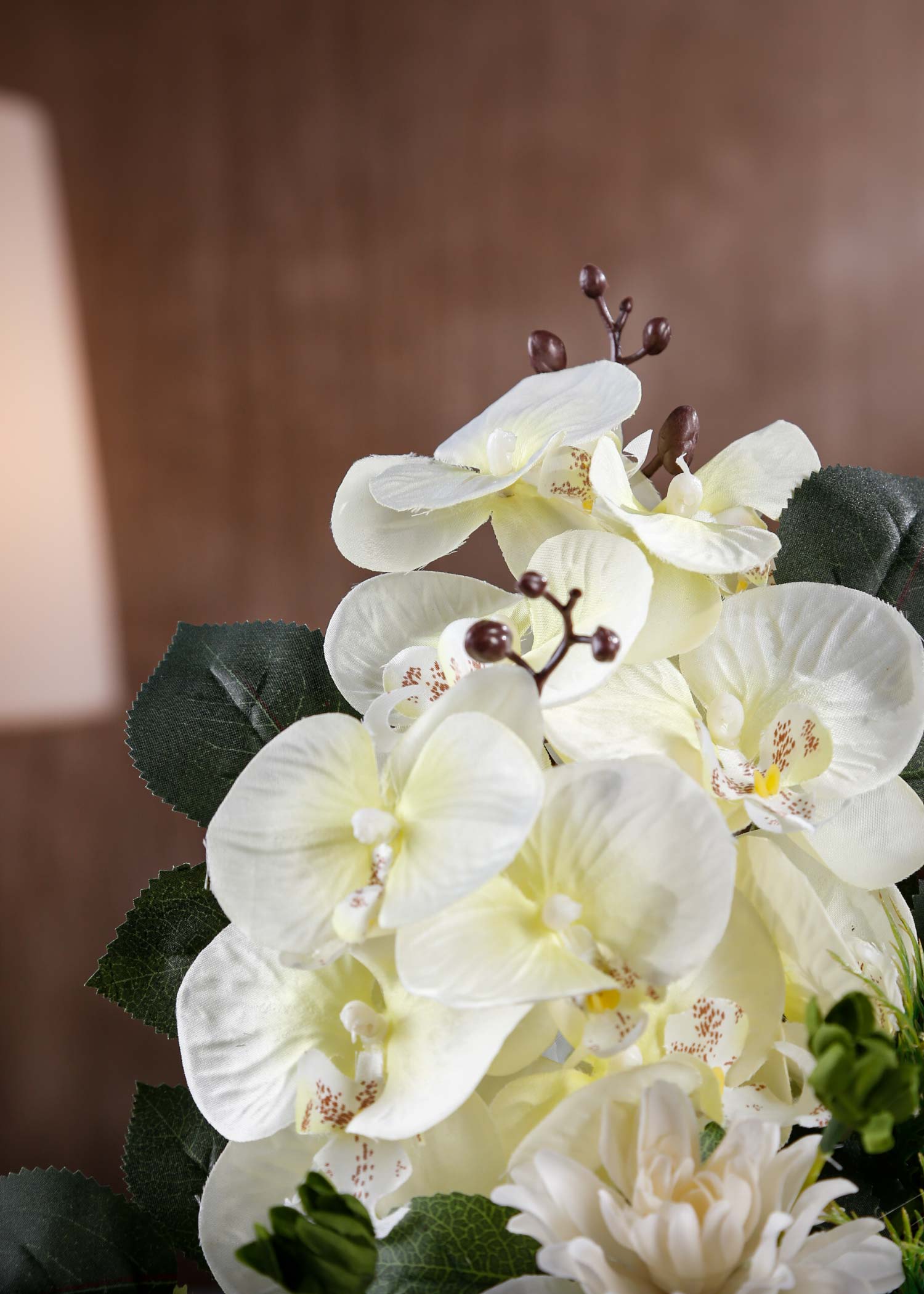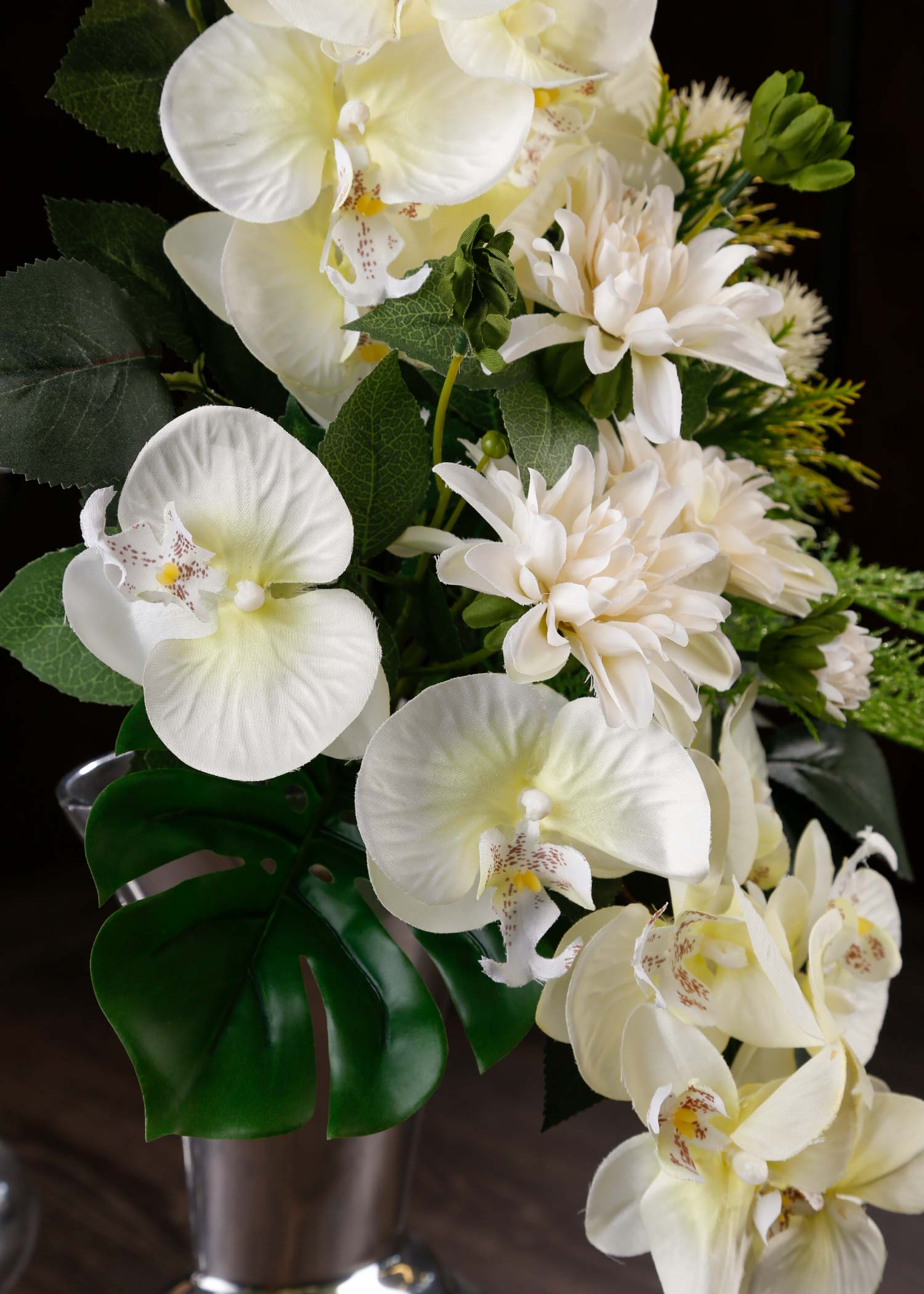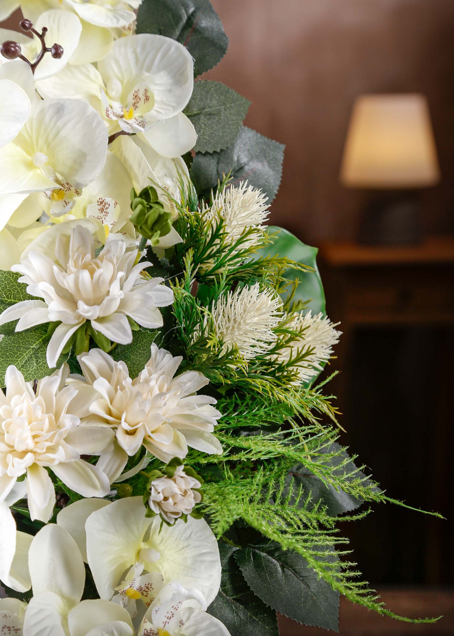 Il design dei bouquet di fiori finti per cimitero si distingue per la sua eleganza e sobrietà. La combinazione di fiori bianchi, come Orchidee e Dalie, abbinata a foglie verdi intense, crea un contrasto cromatico che dona profondità e armonia alla composizione. Il bianco, simbolo di purezza e rispetto, è perfetto per esprimere un affetto sincero, mentre il verde delle foglie accentua l’aspetto naturale e realistico del bouquet.