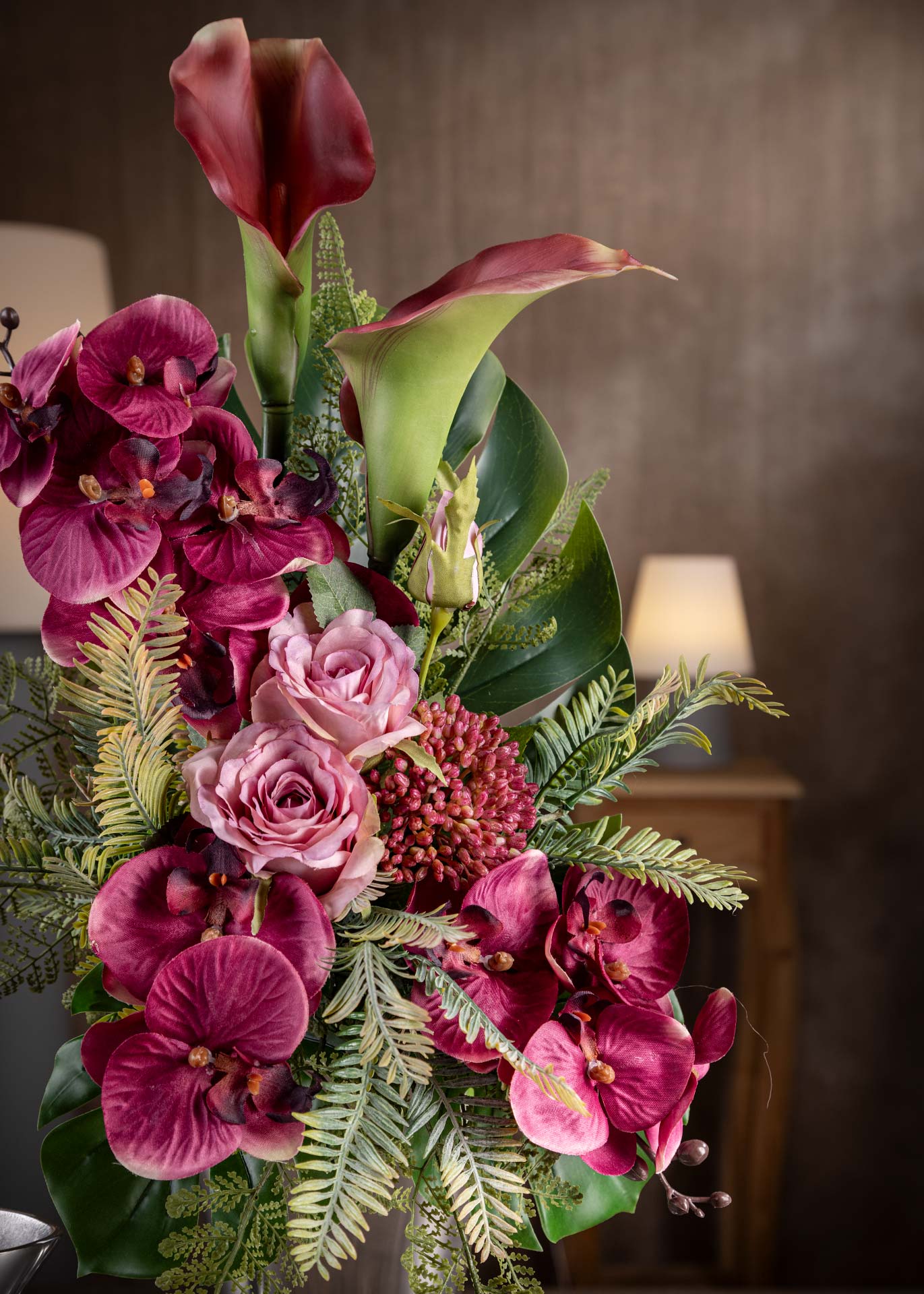 Un mazzo di orchidee finte per cimitero con calle in lattice è un dono prezioso e significativo. Un tocco di classe e di eleganza che esprime il tuo amore e la tua affezione per i tuoi cari che non ci sono più, donando un tocco di colore e di bellezza al luogo del loro riposo.
